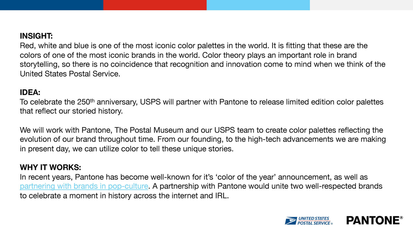 Inspired by Pantone’s Color of the Year and their high-profile design collaborations, I pitched a USPS x Pantone partnership tied to the Postal Service’s 250th anniversary—a way to celebrate the brand’s evolution through a curated color narrative.